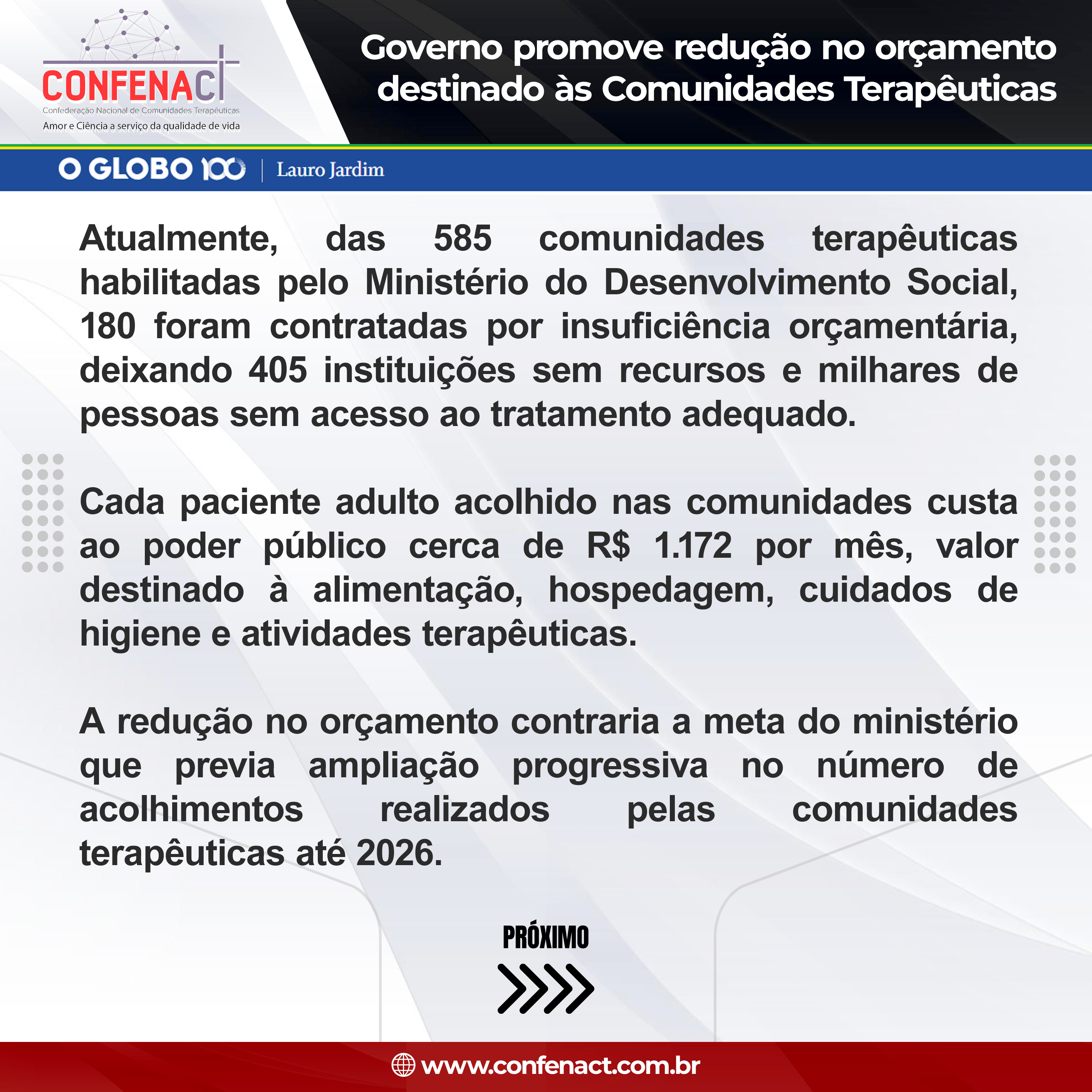 Atualmente, das 585 comunidades terapêuticas habilitadas pelo Ministério do Desenvolvimento Social, 180 foram contratadas por insuficiência orçamentária, deixando 405 instituições sem recursos e milhares de pessoas sem acesso ao tratamento adequado.