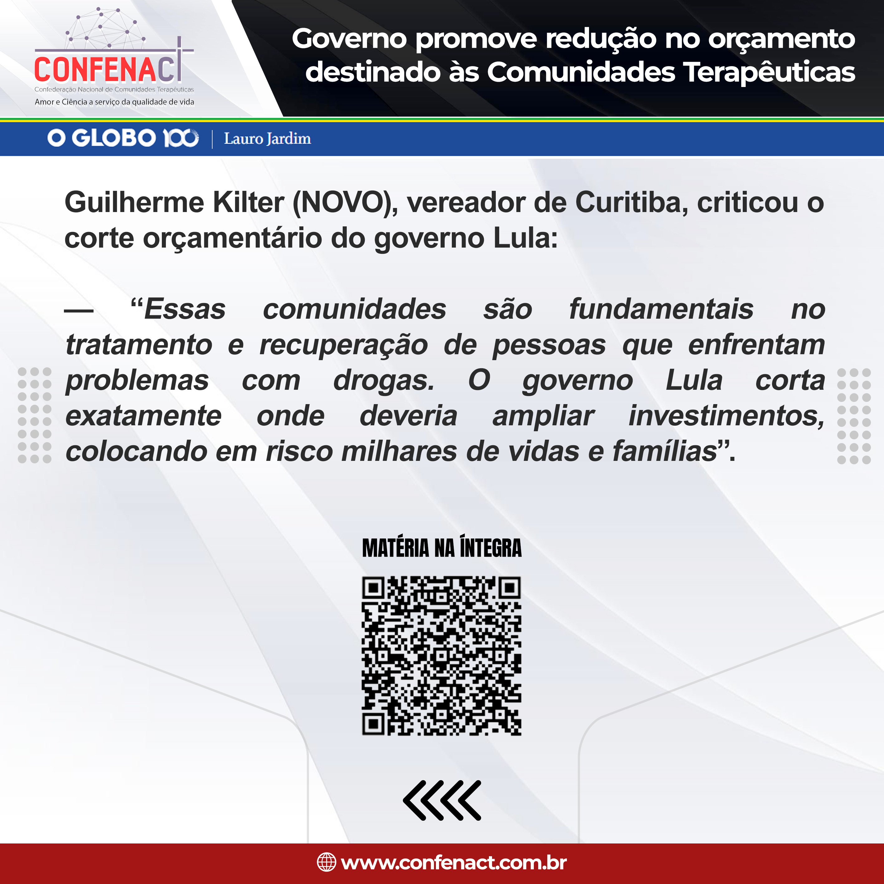 — “Essas comunidades são fundamentais no tratamento e recuperação de pessoas que enfrentam problemas com drogas. O governo Lula corta exatamente onde deveria ampliar investimentos, colocando em risco milhares de vidas e famílias”.