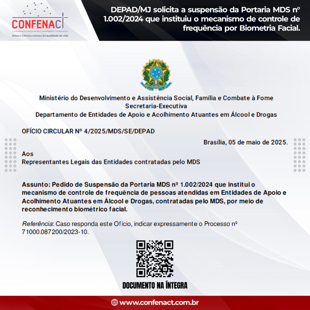DEPAD/MJ solicita a suspensão da Portaria MDS n° 1.002/2024 que instituiu o mecanismo de controle de frequência por Biometria Facial.