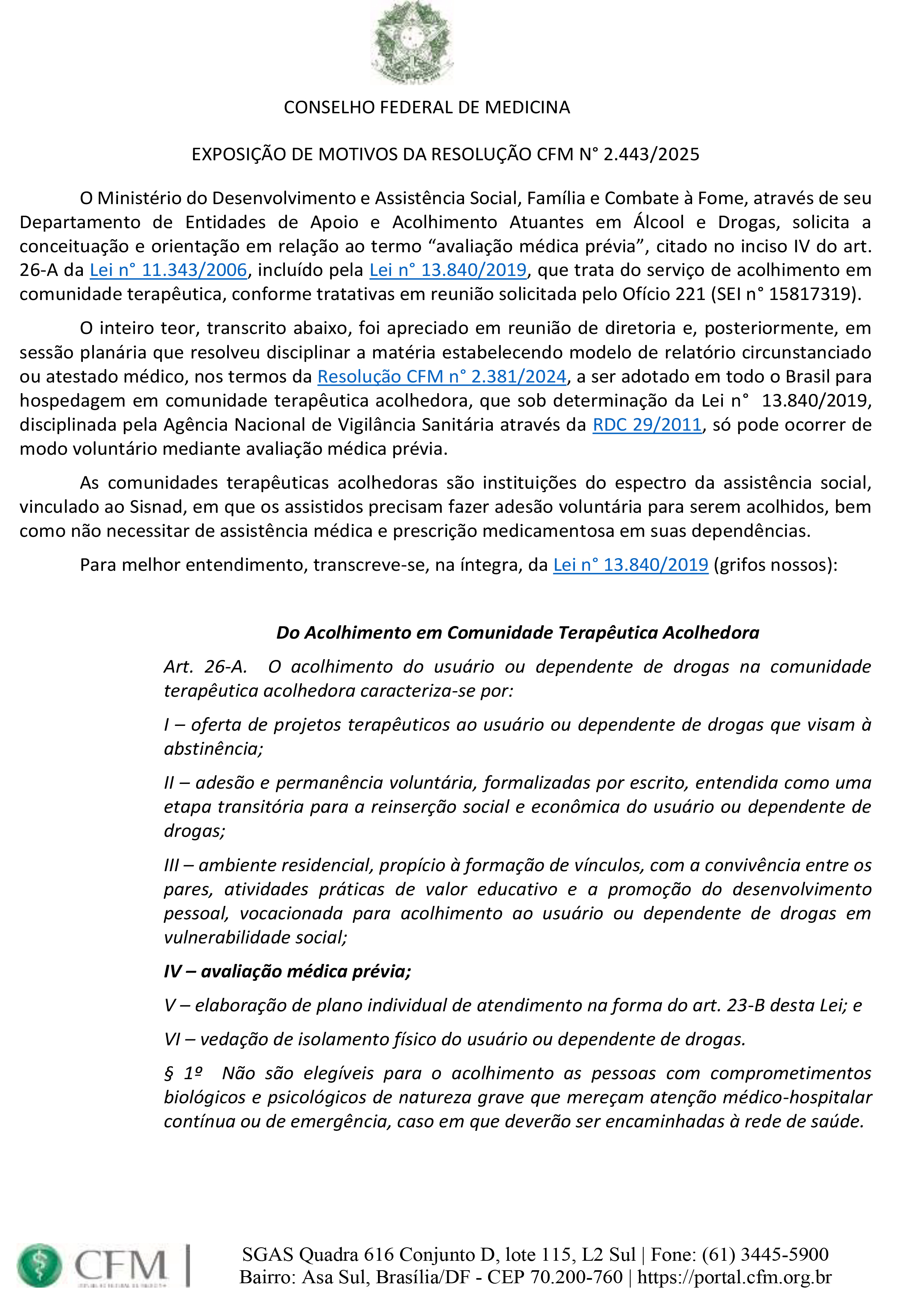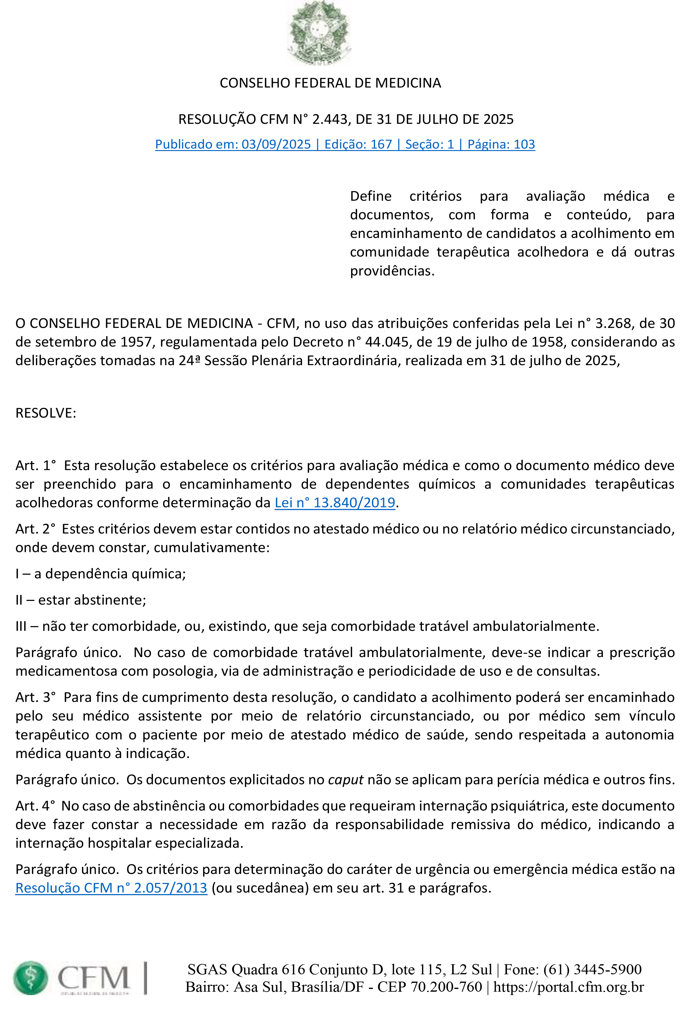 O Conselho Federal de Medicina (CFM) publicou, no Diário Oficial da União de 3 de setembro de 2025, a Resolução nº 2.443/2025, que define critérios para avaliação médica e padroniza os documentos necessários ao encaminhamento de dependentes químicos para comunidades terapêuticas acolhedoras.