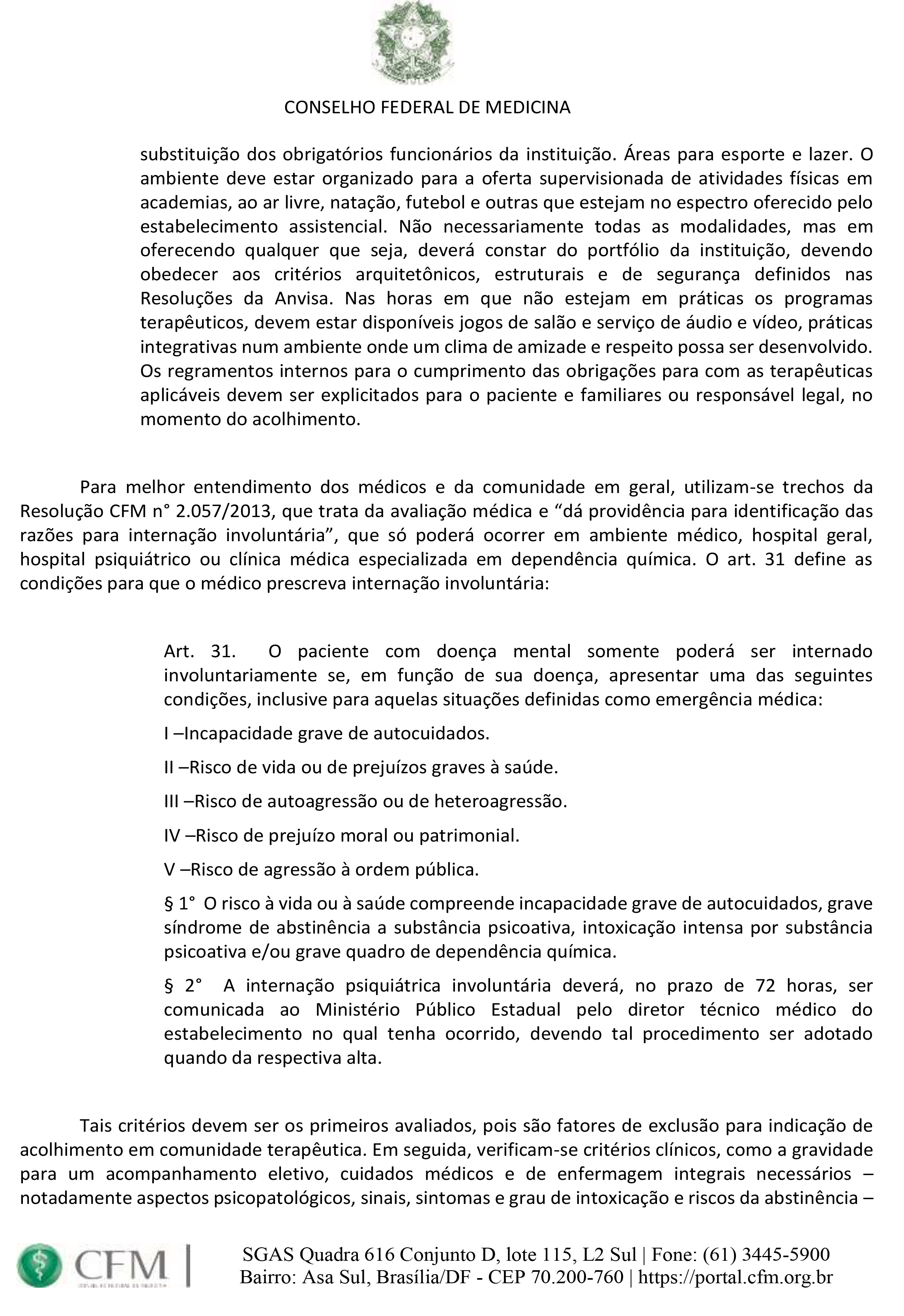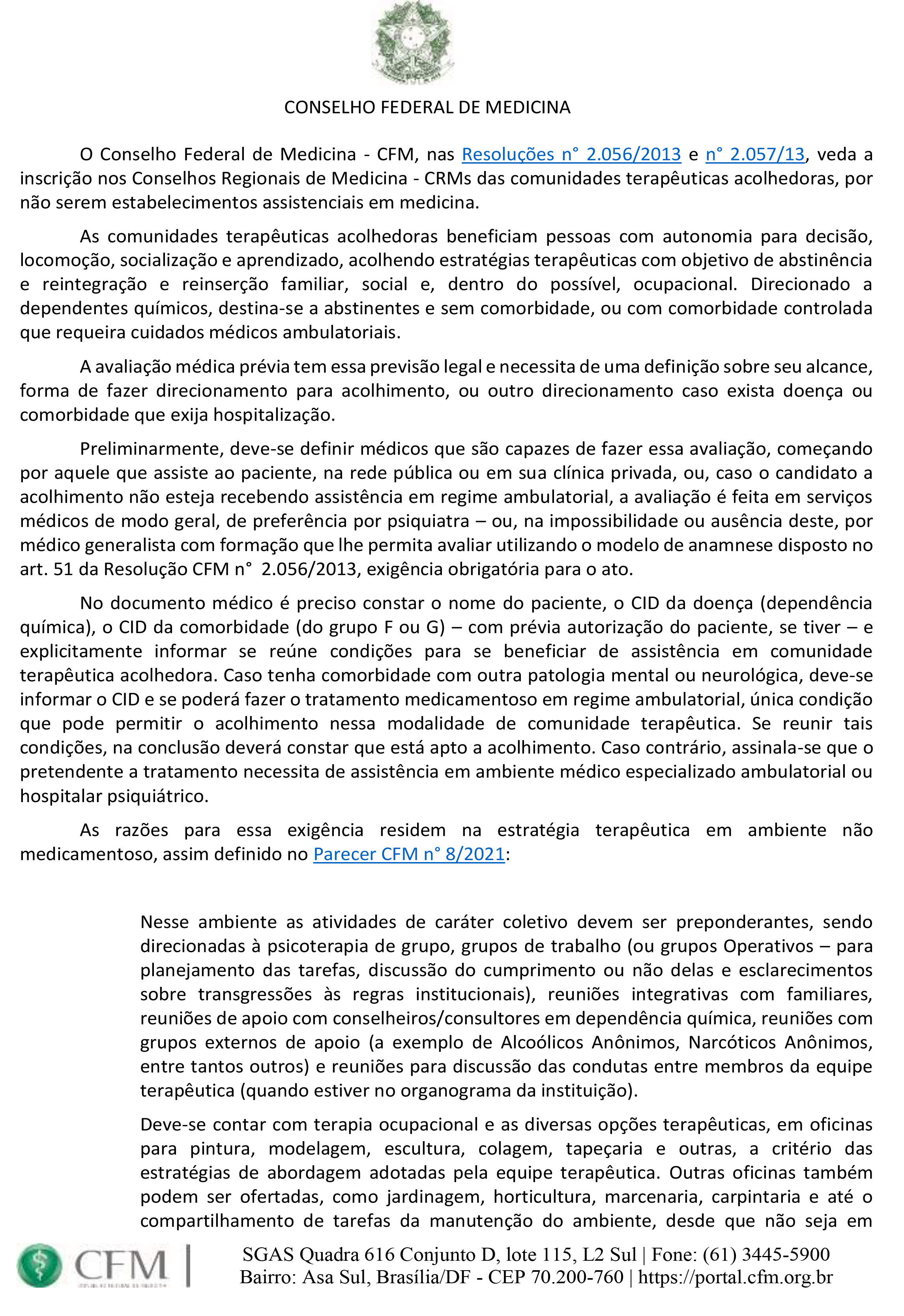 O CFM reforça que as comunidades terapêuticas não são estabelecimentos médicos, mas espaços de reintegração social, sendo indispensável a avaliação médica prévia para garantir a segurança e a legalidade do acolhimento.
